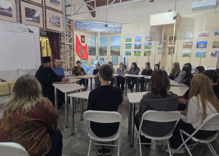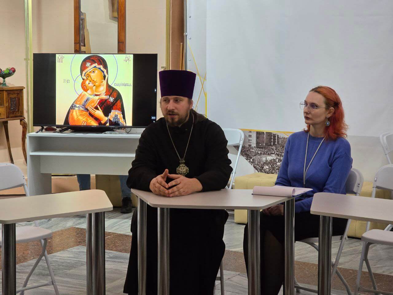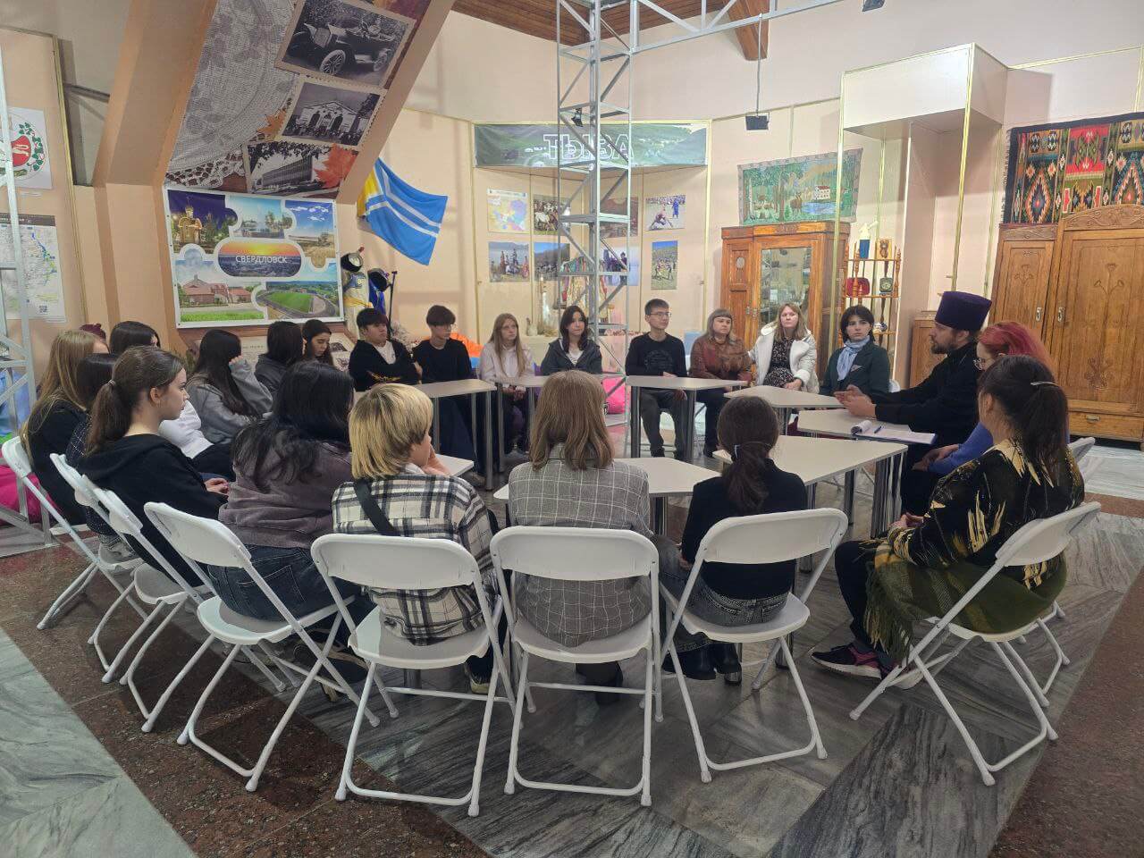 10 октября в Свердловском краеведческом музее был проведен круглый стол, посвященный празднику «Покров Пресвятой Богородицы». В мероприятии принимали участие: ученики 8го класса ГБОУ Свердловский лицей № 1, настоятель Свято-Митрофановского храма, Благочинный Должанского церковного округа, — протоиерей Александр Ястребов.